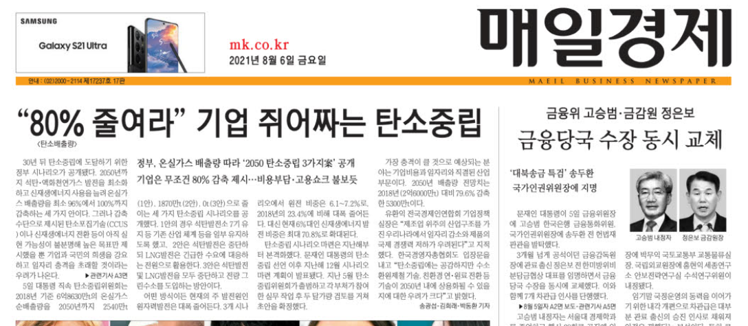 대통령 직속 탄소중립위원회, 탄소중립 시나리오 세가지 안 공개. 2018년 6억8천만t 온실가스 순배출량을, 1안은 석탄발전소 7기 등 기존산업 일부 유지해 2050년까지 2540만t까지 줄이는안으로, 2안은 석탄발전 중단, LNG 긴급수요전원으로 사용해 1870만t까지 줄이는 안으로, 3안은 석탄, LNG 모두 중단하고 그린수소 전량도입해 0t으로 줄이는 안. 어떤 방식이든 원자력발전은 대폭 줄고 신재생에너지 발전비중이 최대 70.8%까지 확대되. 탄소포집기술이나 수소환원제철 기술, 친환경 연.원료전환기술 등 신재생에너지 전환 등이 아직 실현가능성이 불분명한 상황에서 기업과 국민의 희생을 강요하는 것아니냐는 우려 나와.